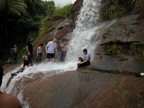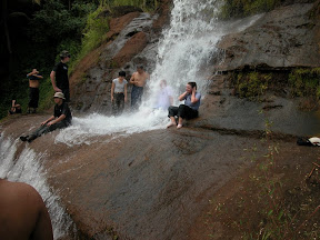Waterfall site #1. Here, Gwyddon's getting ready to take a voluntary pounding by the water that's falling about 25 feet. Lisa (to the right of the waterfall) is debating whether or not she wants to abuse herself in like manner...