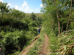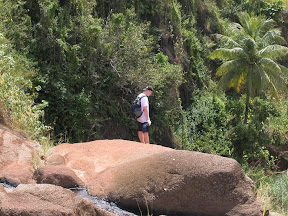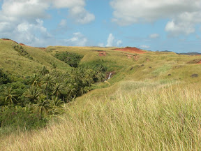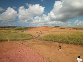 The first glimpse of one of the two waterfalls we'd visit today. Strangely grassy here. You'd think a tropical island would be all coconut trees and monkeys, but apparently it looks a lot like the African Plains... with waterfalls and palm trees and some really strange-looking dirt (way in the distance). Mars? Maybe...